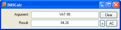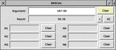 10 REM >BASCalc Source code 20 REM (C)1999 PAUL VIGAY 30 REM Inspired by !Calcula, by Iain Logan and thanks are due to him for the idea. 40 REM Please feel free to examine my rudimentary wimp library and experiment to 50 REM create your own applications. A limited number of comments have been inserted for you! 60 version$="1.05 (12th Mar 2006)" : ver$=LEFT$(version$,4)