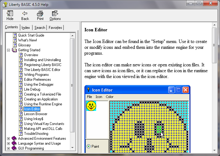 The Help system supplied with Liberty Basic has been the source of some debate. Liberty Basic v4.03 and earlier came with a file in WinHelp format which opened in the Microsoft Help Browser, providing a Table of Contents, an alphabetical Index and a full text Search.